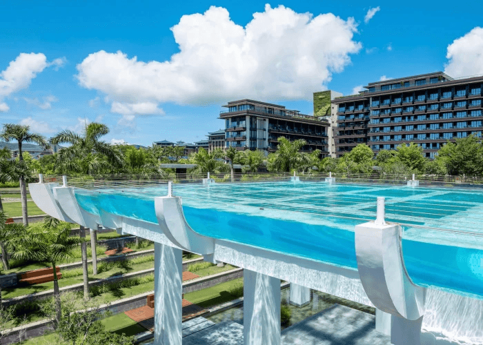 Clear pools add a modern, bright look. The light goes through the acrylic and makes the whole place look very luxurious. You can feel the outdoors without stepping out.