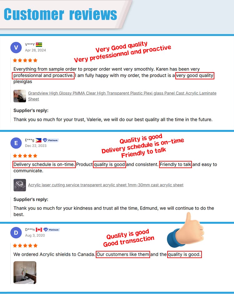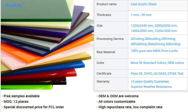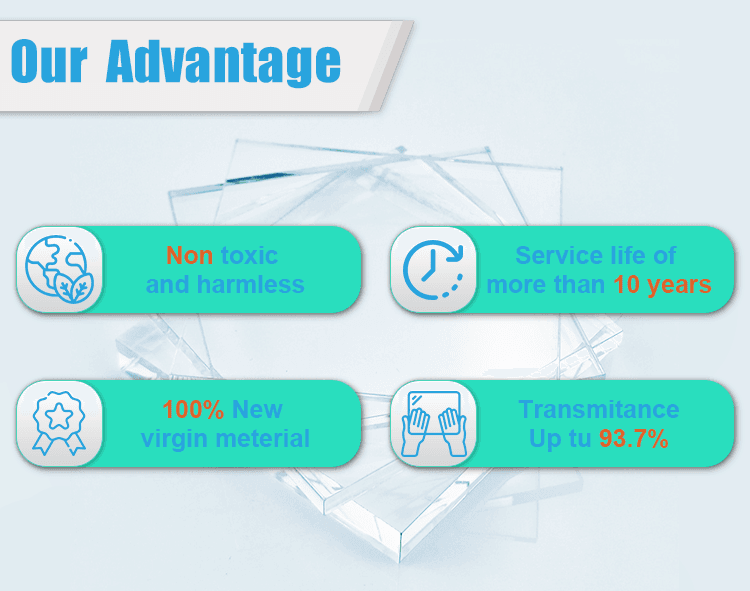 All acrylic sheets are UV resistant. Outdoor use warranty 8-10 years no yellowing no fadingA Grade Cast Acrylic Sheet with 100% pure all new MMA raw material from Lucite SH factoryCO2 Laser cutting No odor no smoke, easy to gule bond, easy to heat bending and formingProvide additional CNC cut, CO2 laser cutting, printing, marking and other customized services